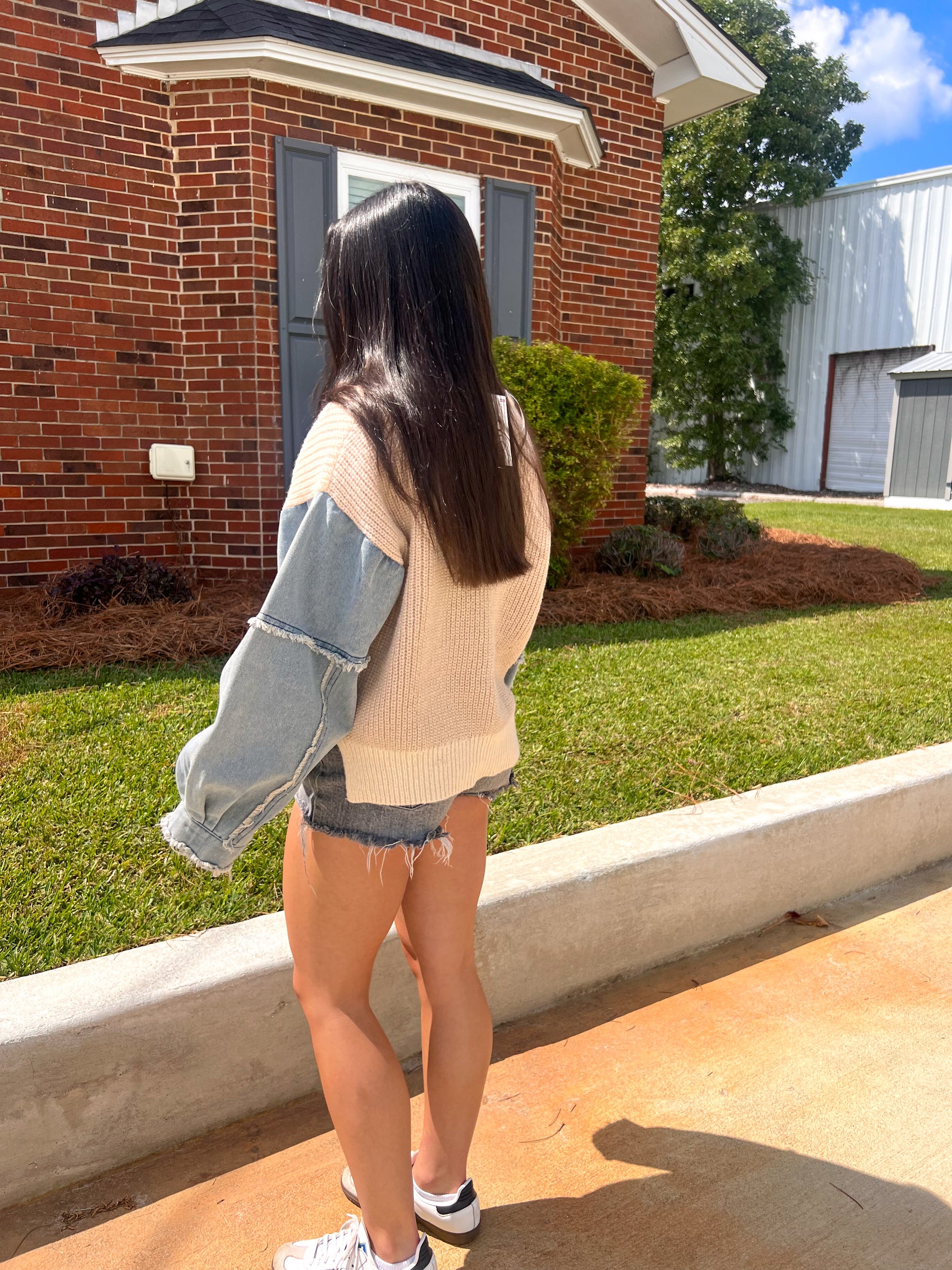 - Our 'Blueberry Oats Sweater' features soft fabric, eye-catching denim sleeves, a flattering boxy fit, and a stunning two-tone color palette.