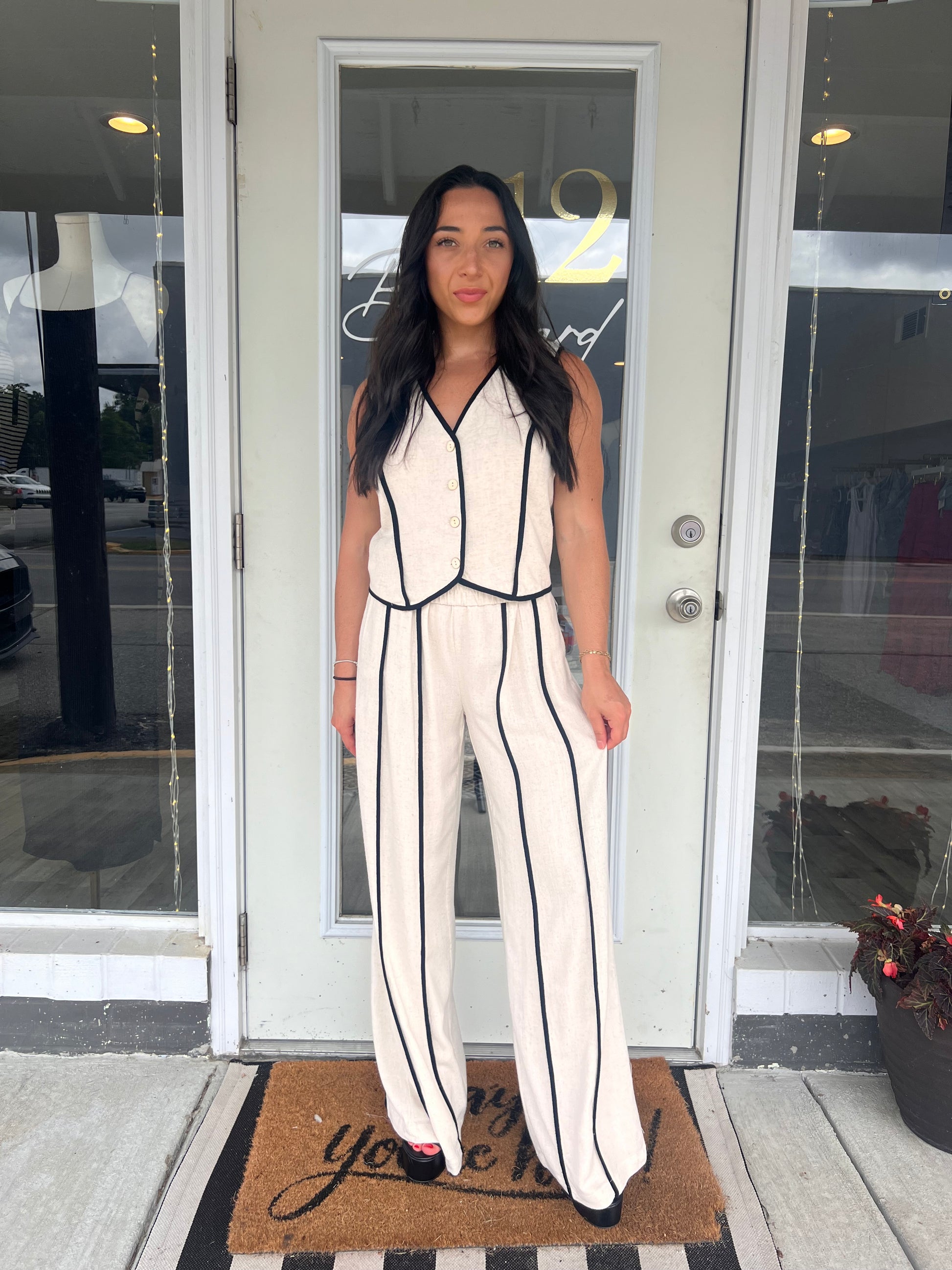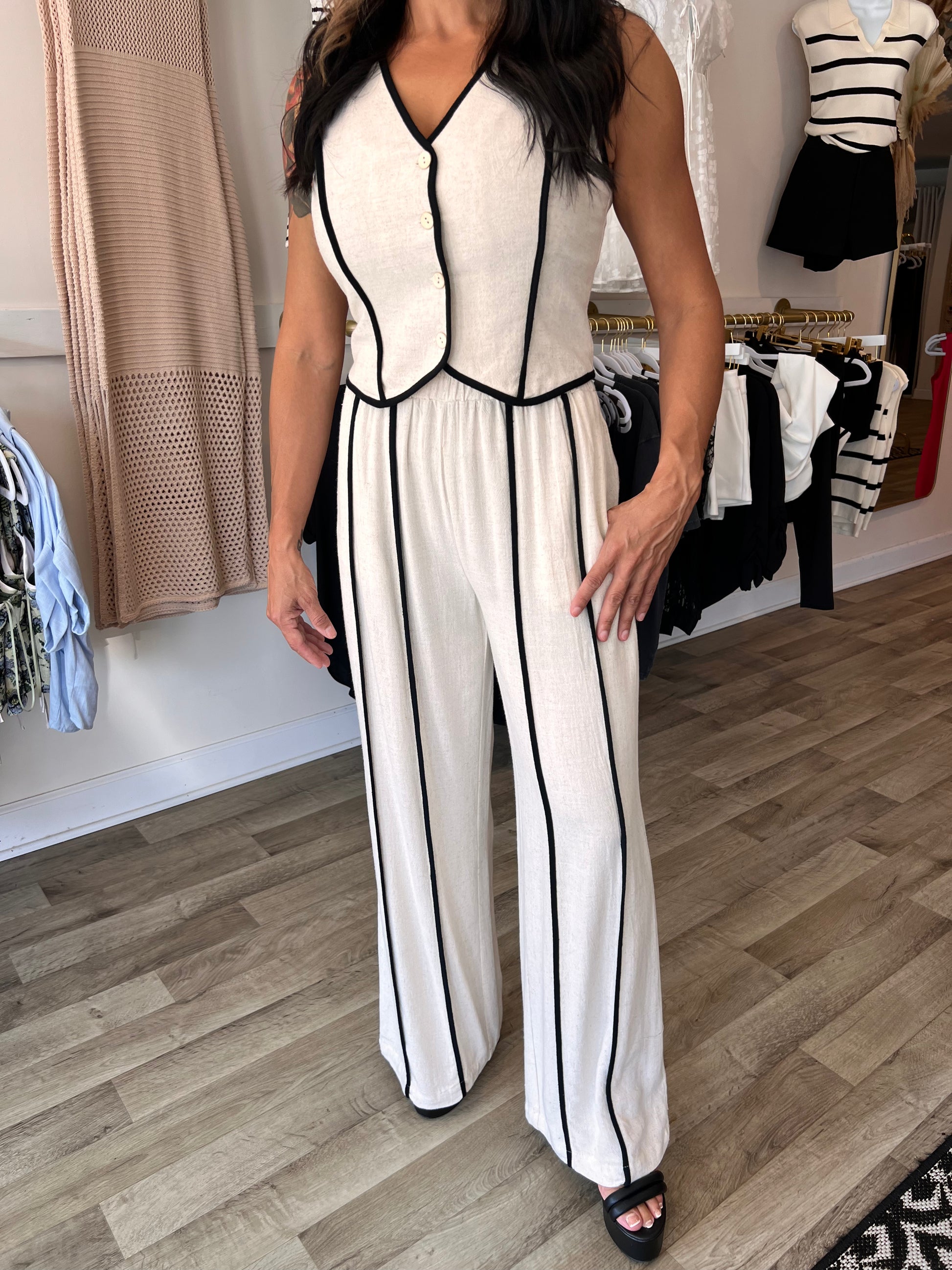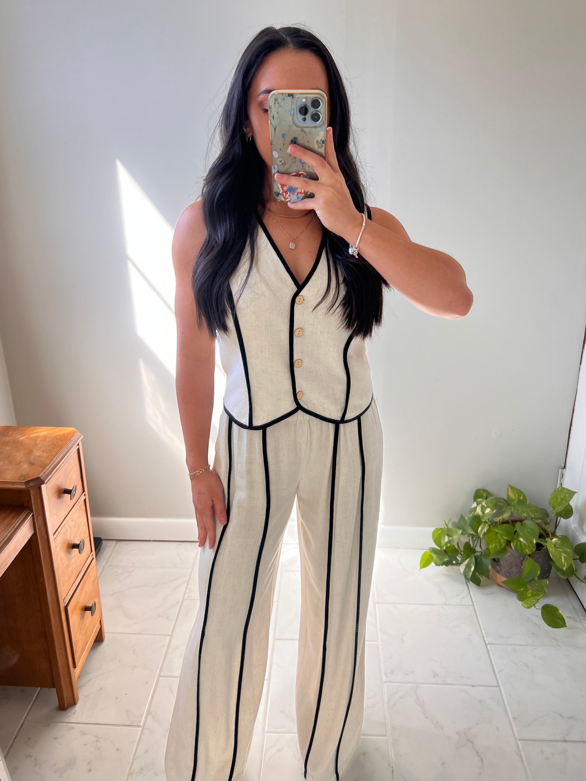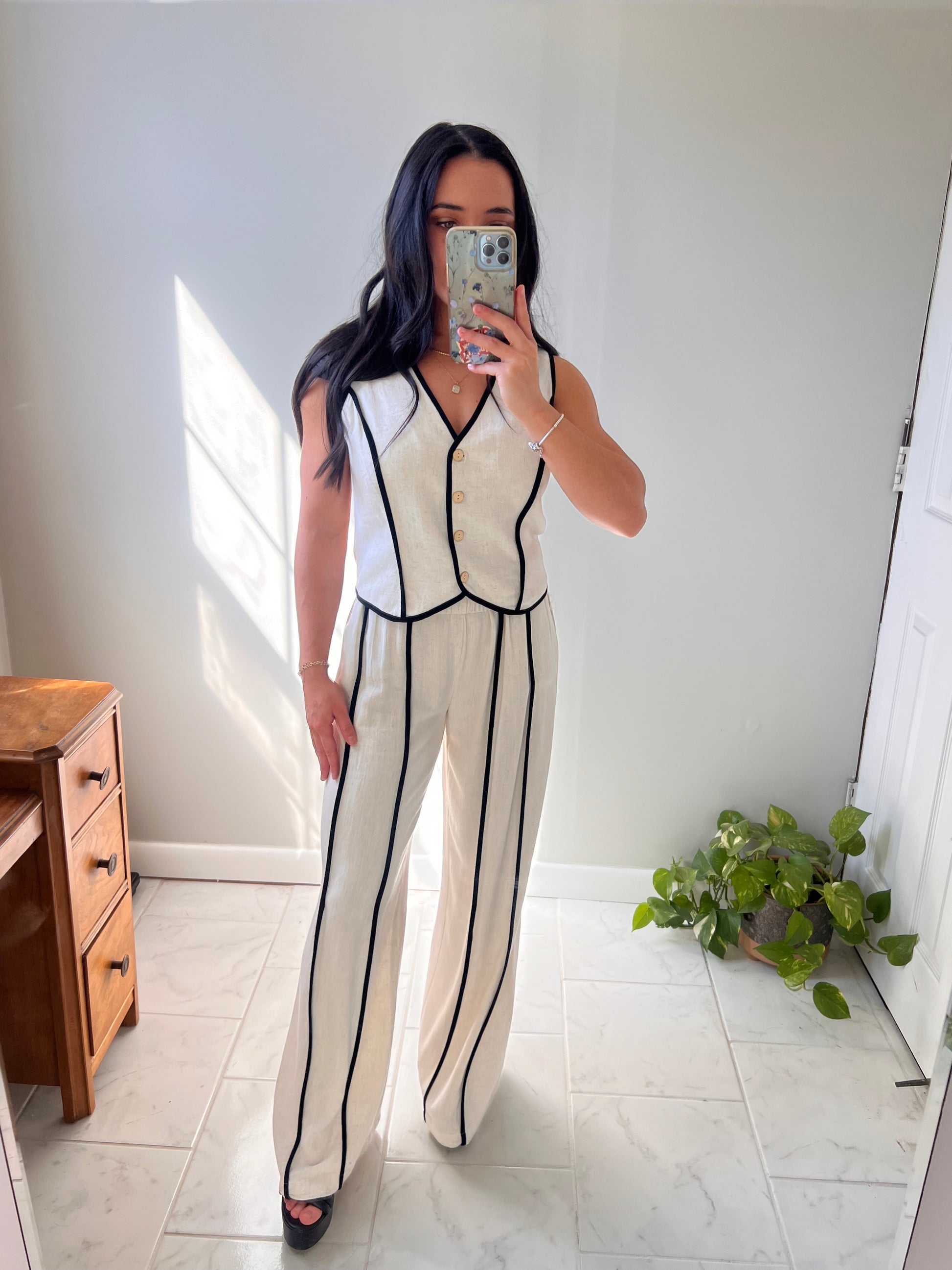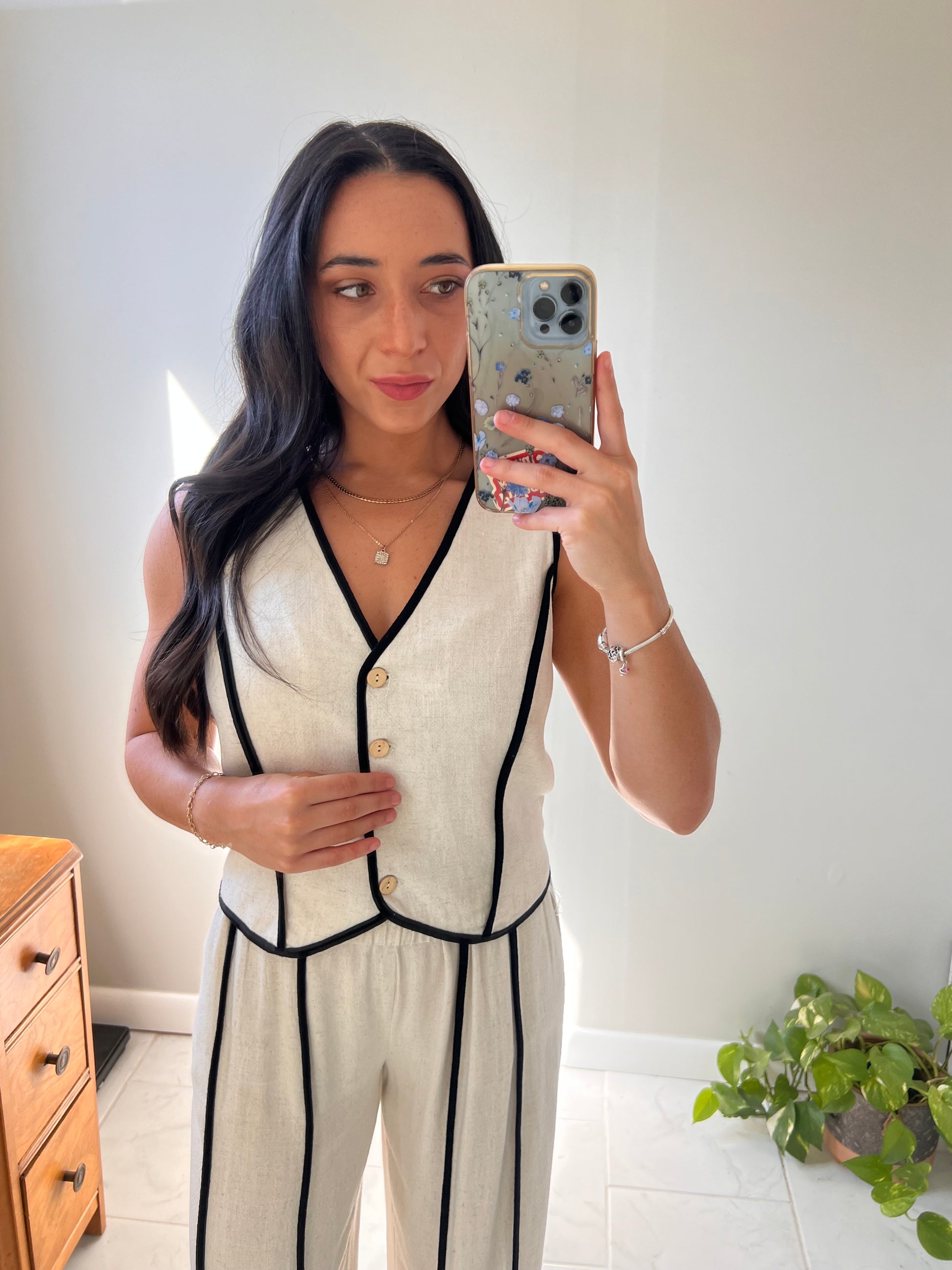 - Our ‘Cool About It Vest’ features a linen fabric, front coconut buttons, pointed hem, and binding details.