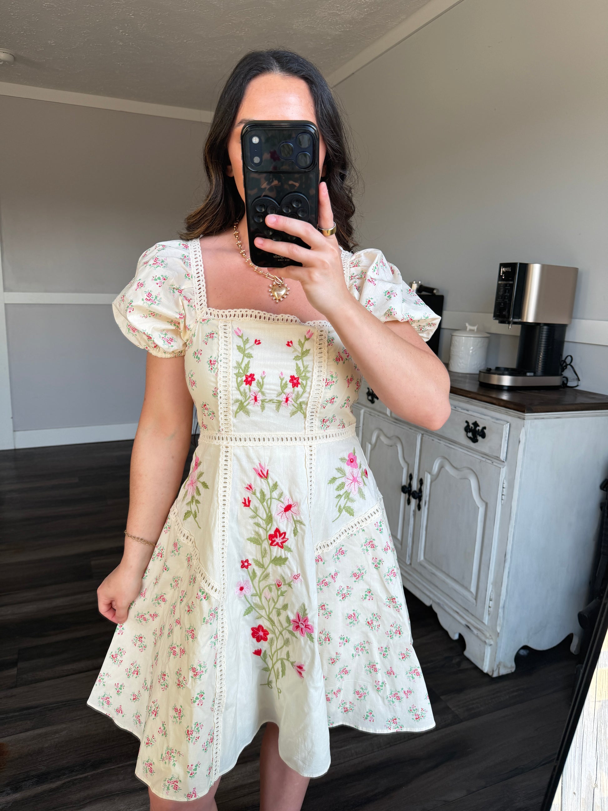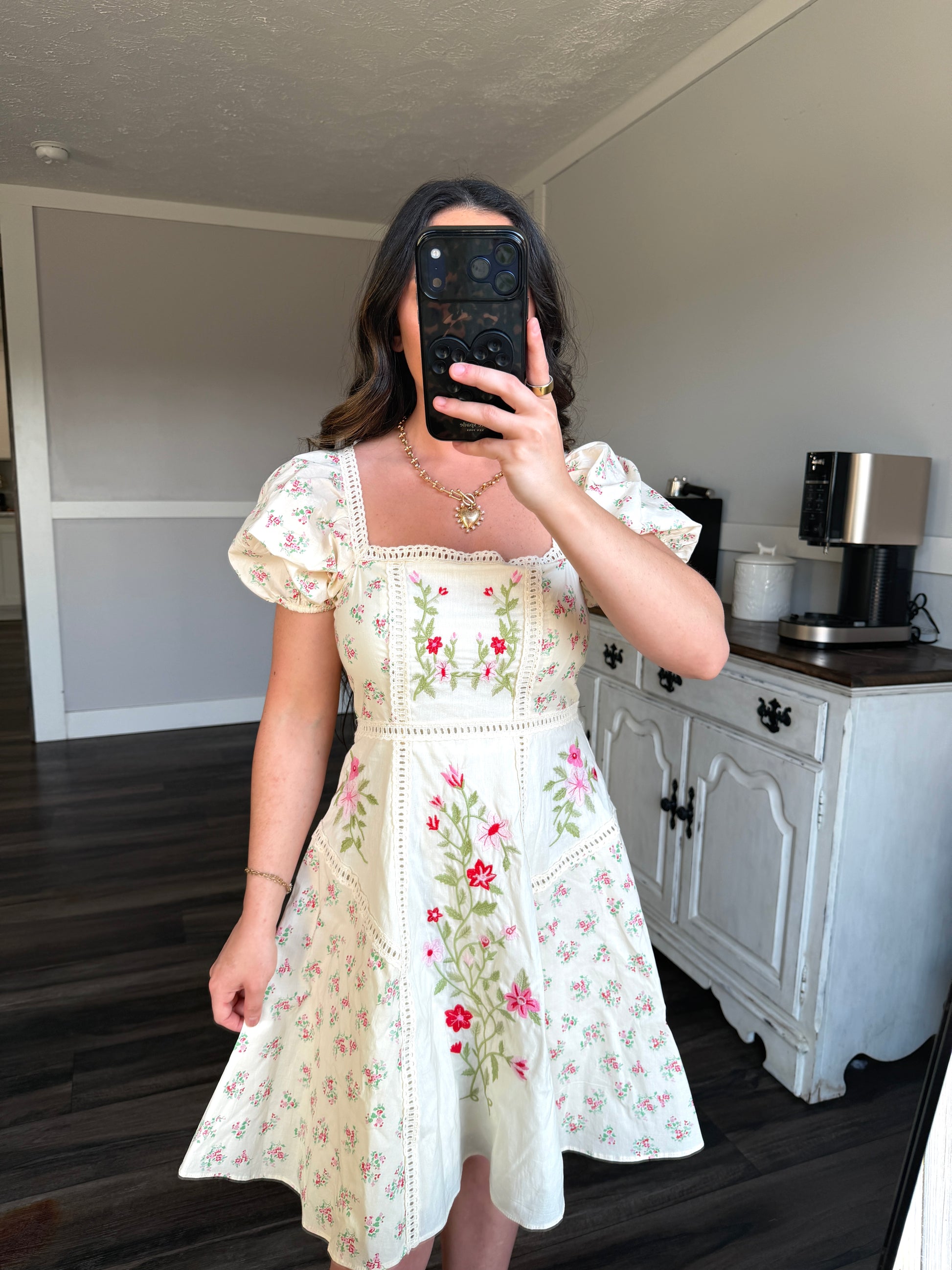 - Our ‘Cottage Garden Midi’ features embroidered mixed florals, mini length, puff sleeves, and a slight adjustable tie for sleeve security.