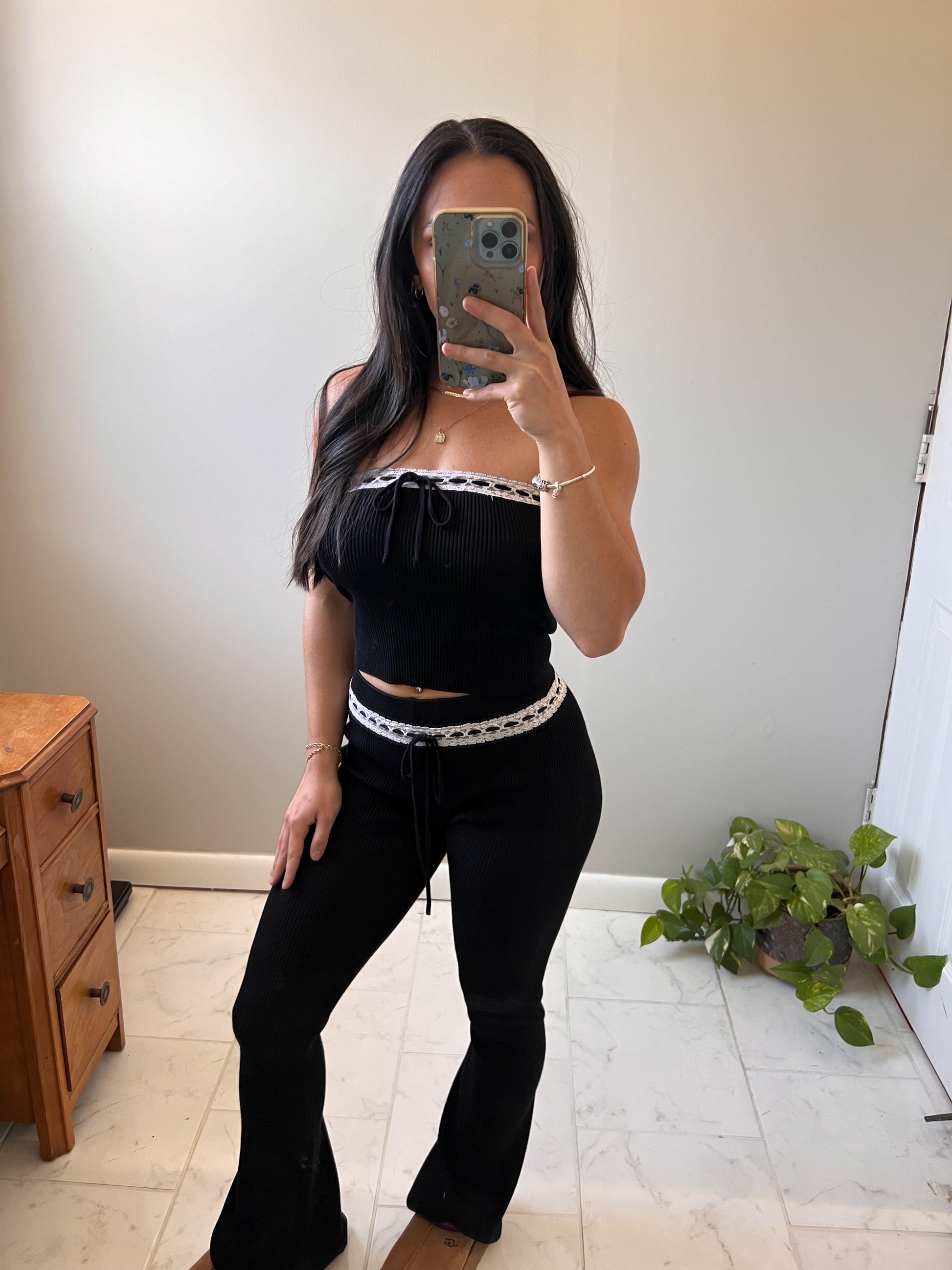 - Our 'Laced In Love Bottoms' feature a stretchy ribbed fabric, delicate lace trimming at the top and flared bottoms with an adjustable bow tie for an effortlessly chic look.