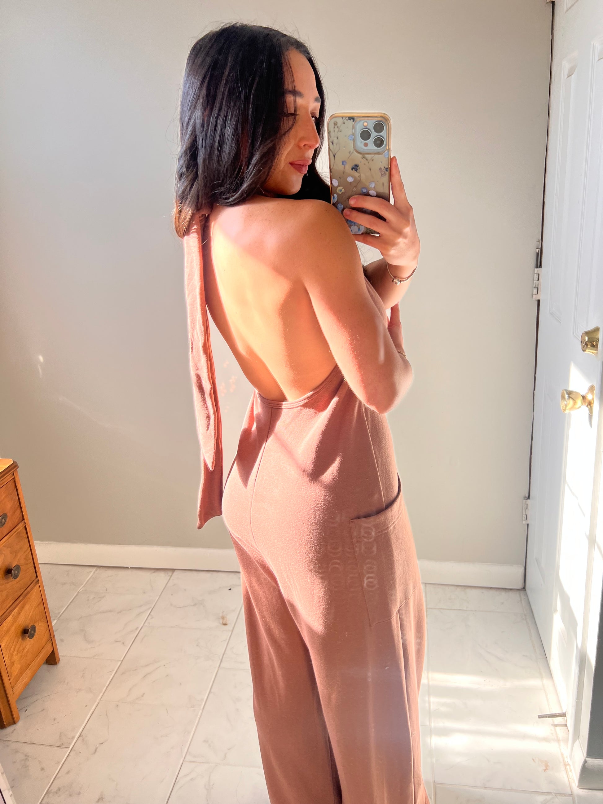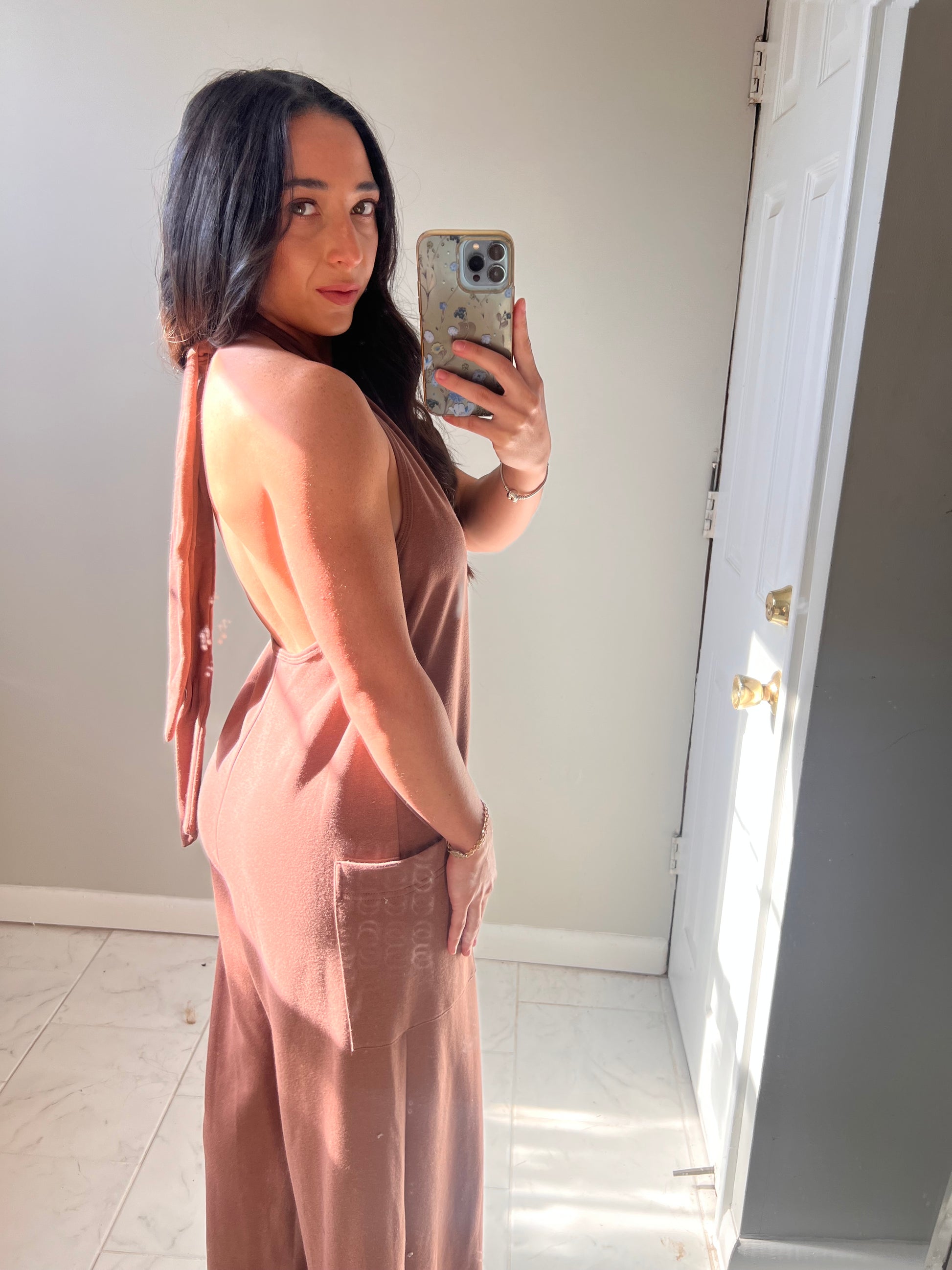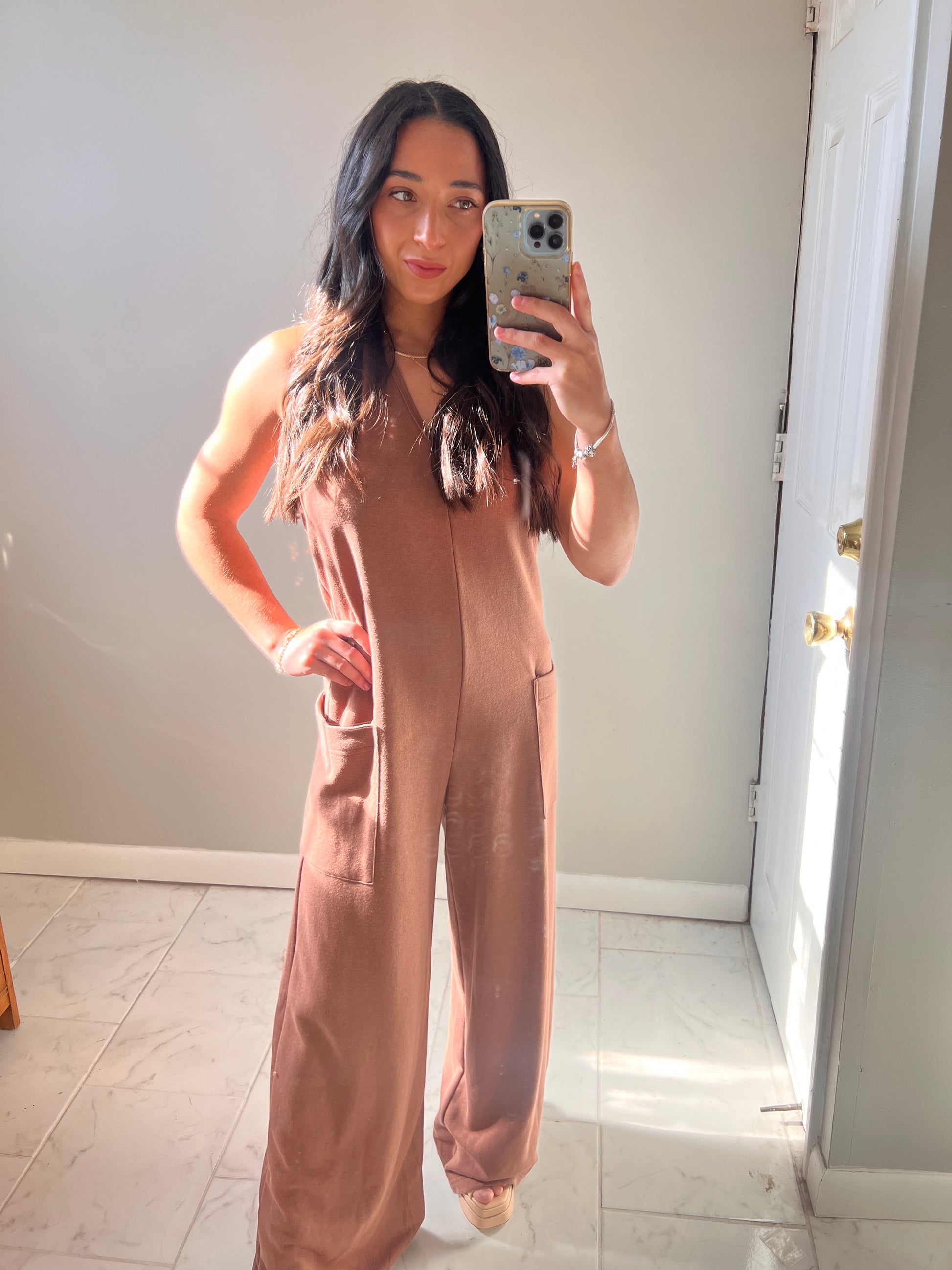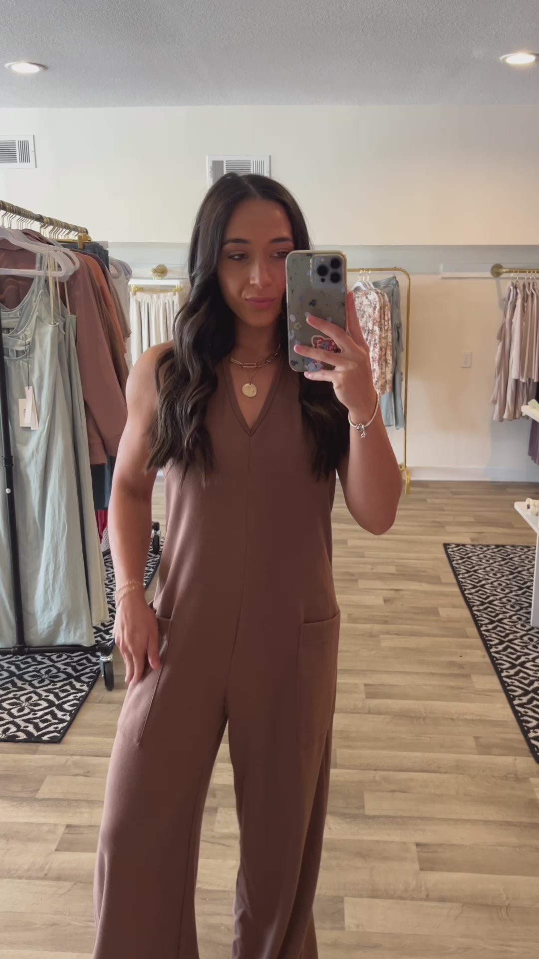 - Our ‘Latte Please Jumpsuit’ features a very relaxing fit, SUPER SOFT FABRIC, V-neckline, adjustable tie at the neck, pockets, and an open back!!!