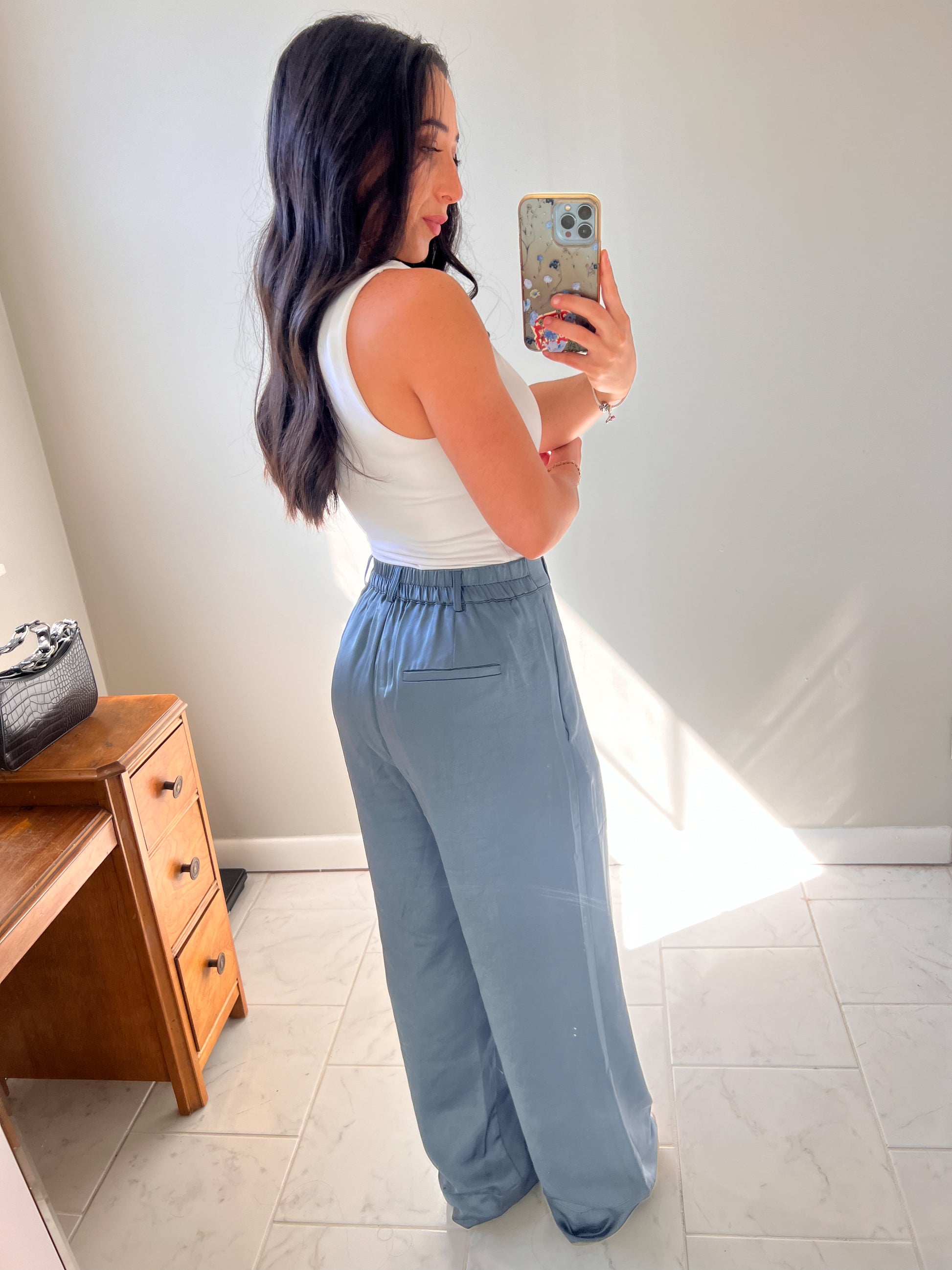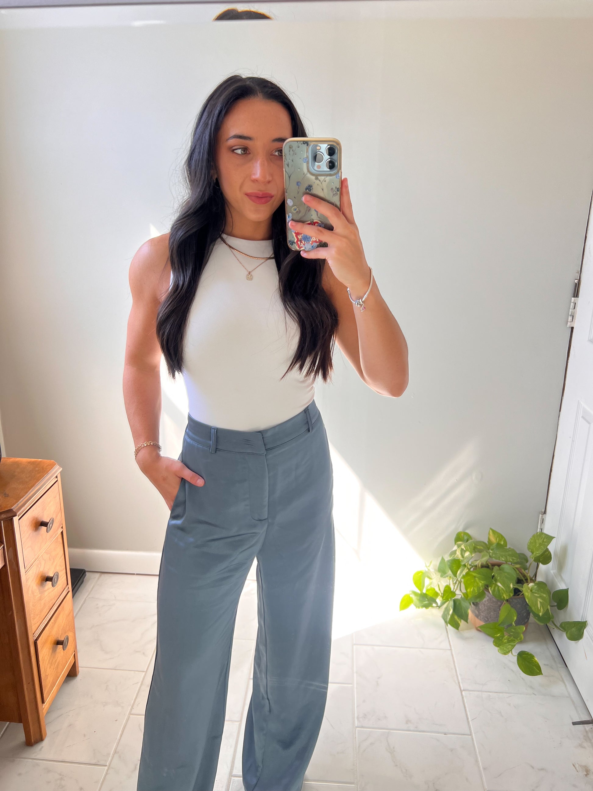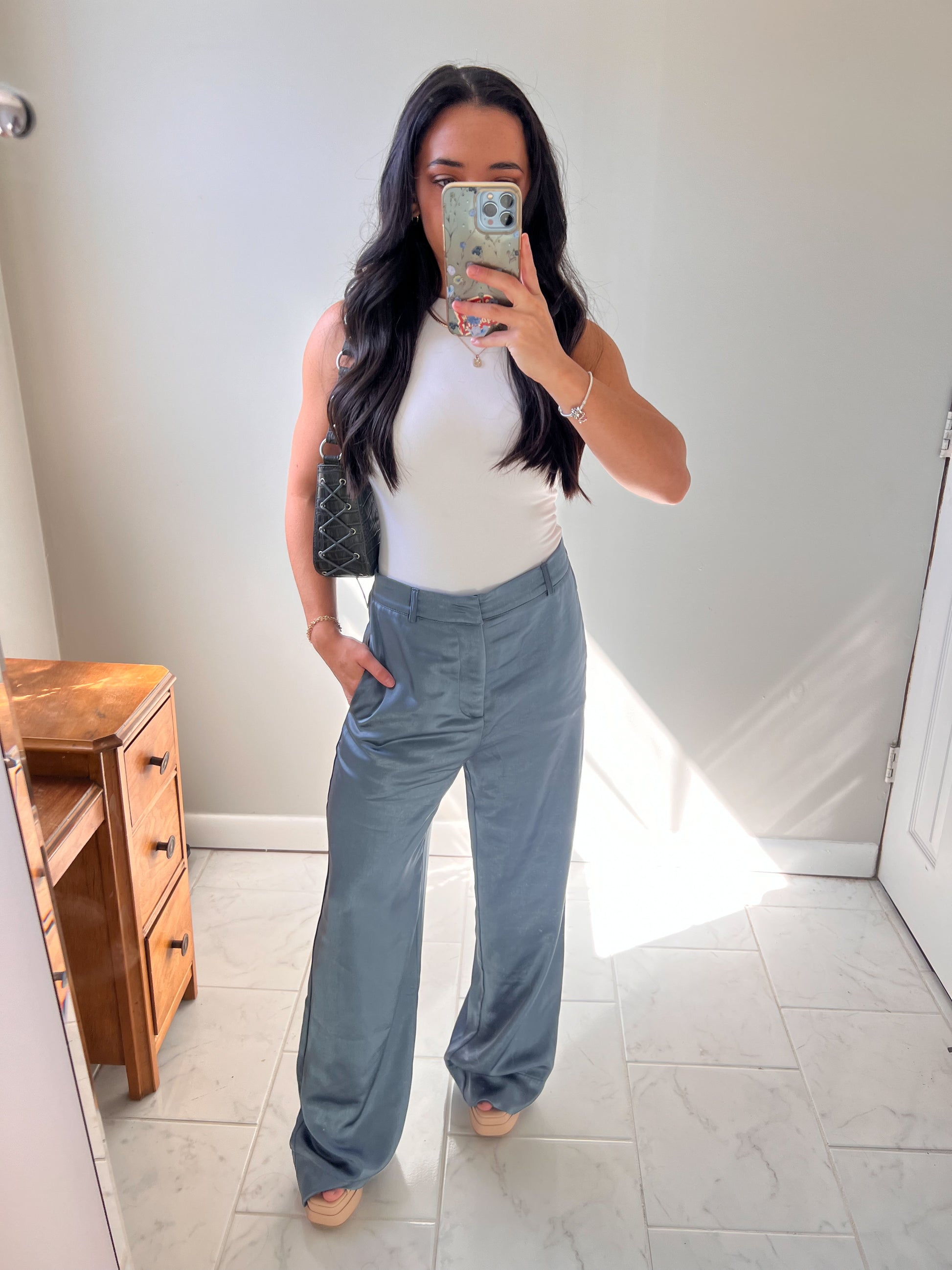 Our ‘satin dove pants’ feature a silky super comfy material, side pockets, high waisted, and sipper closet with belt loops.
