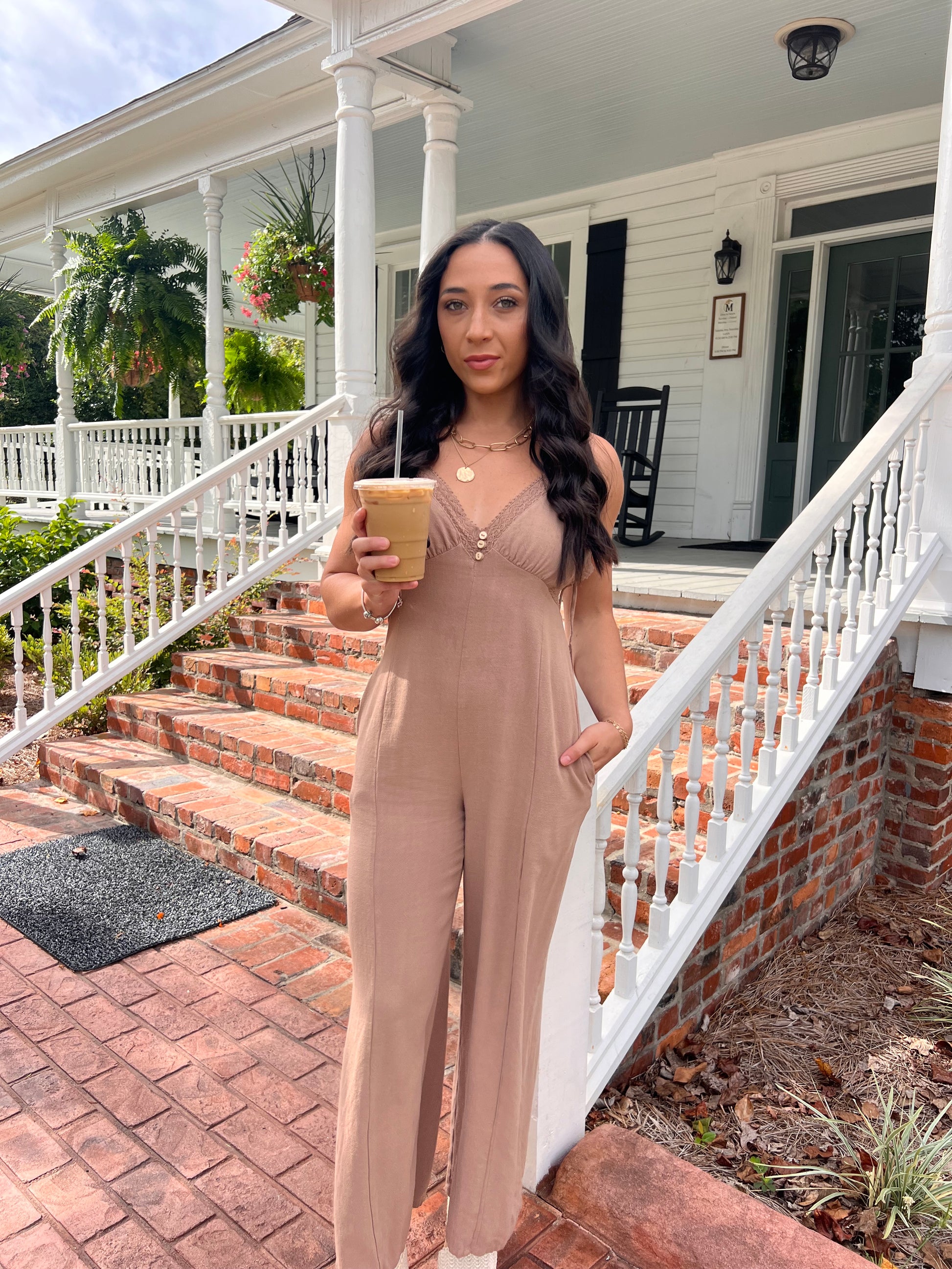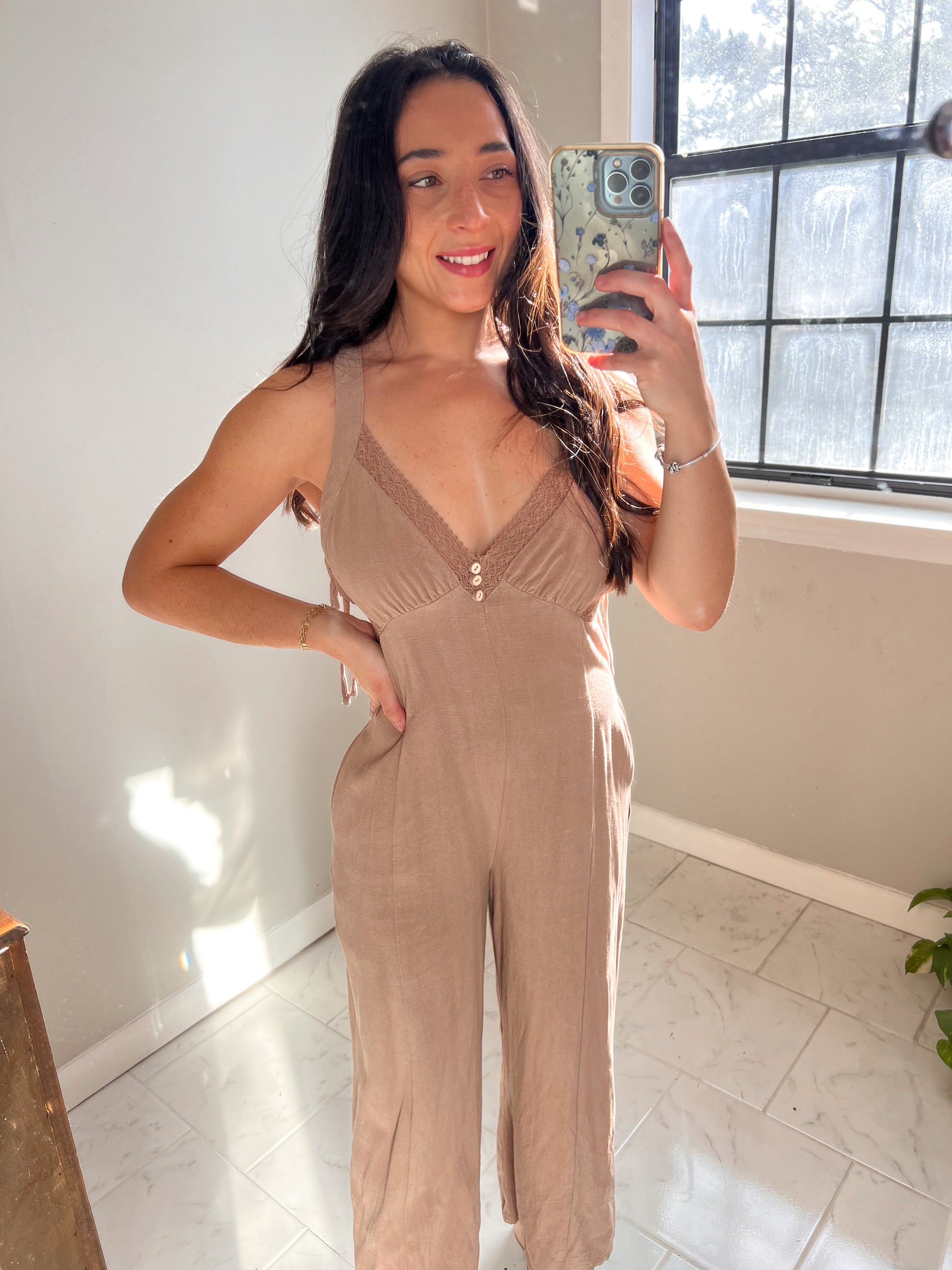 - Our ‘Spill The Tea Jumpsuit’ features adjustable straps, tie sides to adjustable the bust, a deep V-neck with lace trim and button details, side pockets, and a zip up back!
