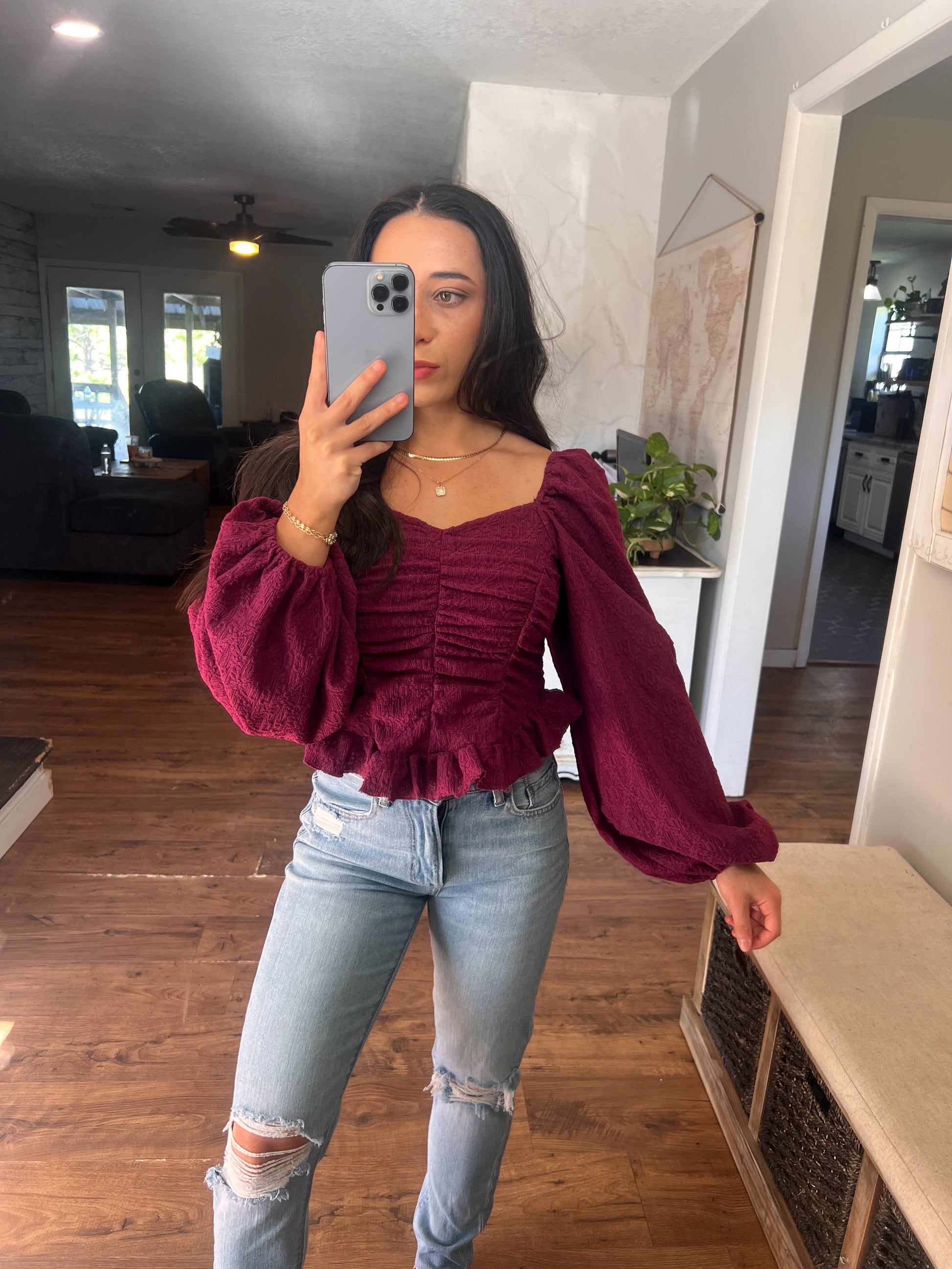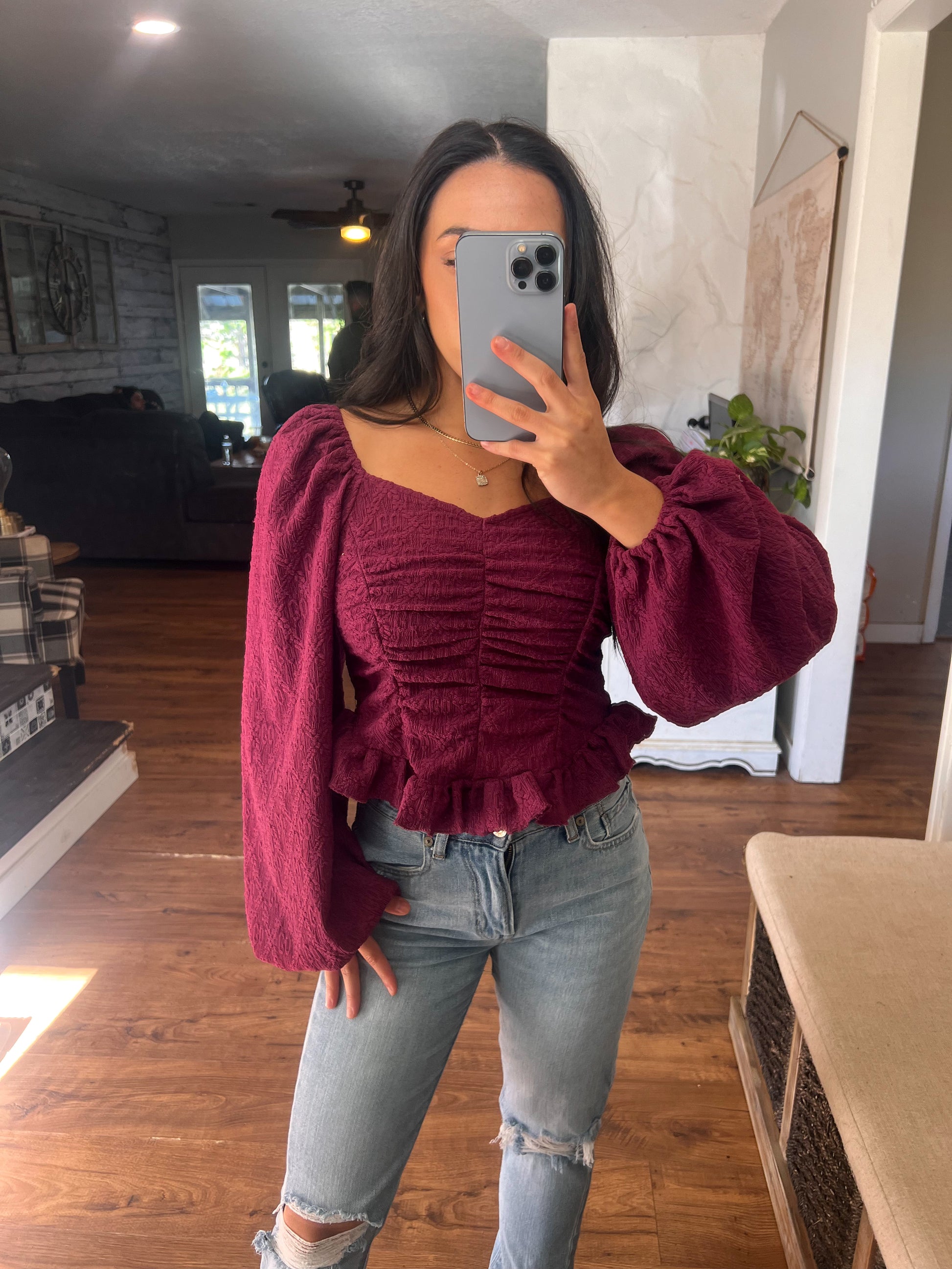 A solid, knit top with the following features: Floral texture. Sweetheart neckline. Corset style, ruched bodice. Long sleeves with elastic cuffs. Round, ruffle hem. Low square back. Relaxed fit.