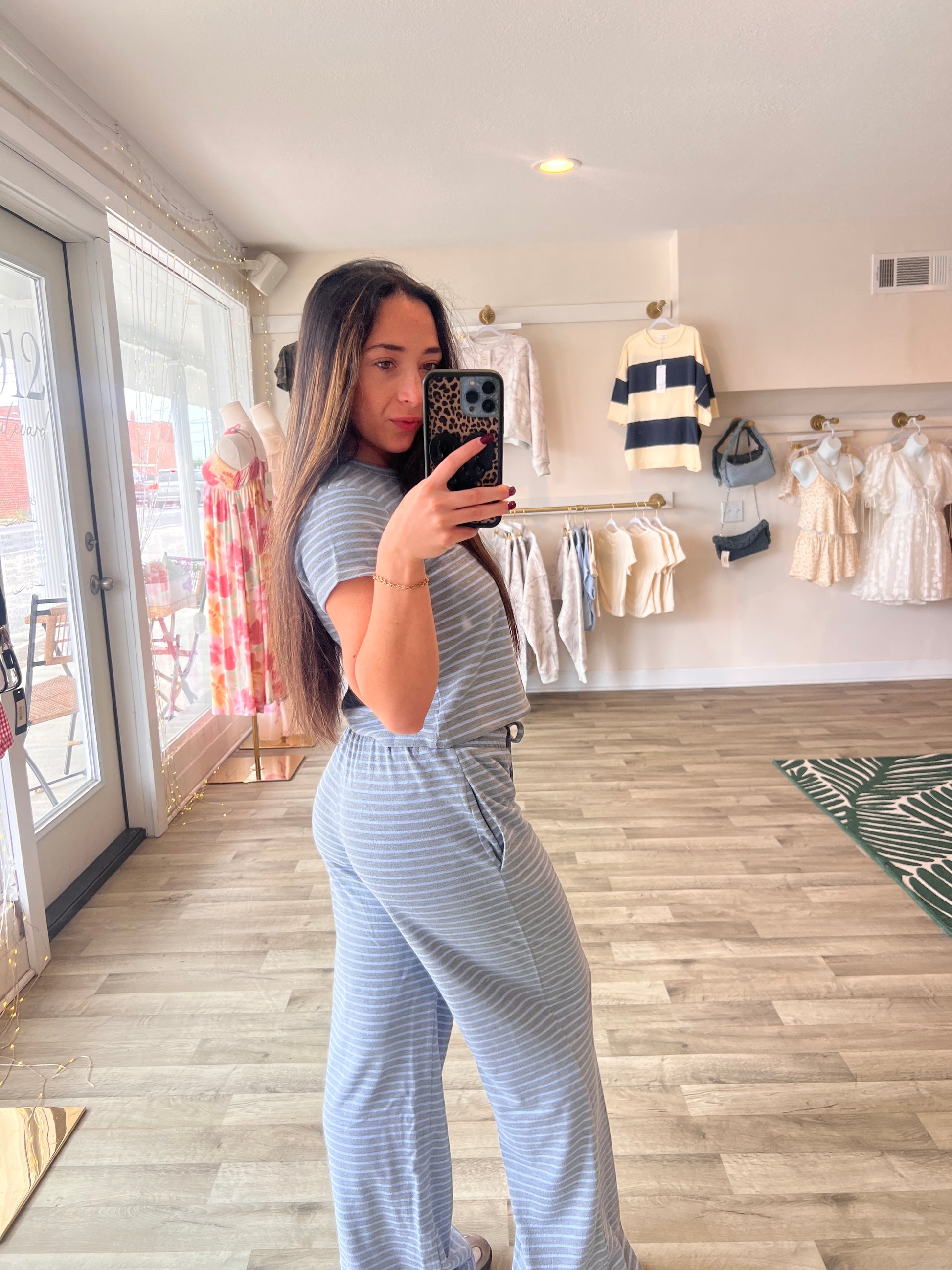 Knit Polyester Cotton Striped Flare Pants With Side Pockets Waist Tie Strap